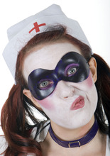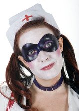 Cowl • This came with the suit, but it was a shapeless hood that wrapped around her chin and didn't have ears. She darted it to fit her head. For the ears, she stuffed 3-D plastic cat ears inside some flat pleather ears and then sewed them into the hood. She cut away the part that wrapped around her chin and added a buckle. She also wears a black pixie-cut wig to conceal her long, dark blond hair.