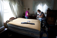 Tiffany Morris sorts through rolled-up posters in the former home of her grandparents, Oscar and Beverly Rowland, in Salt Lake City Wednesday Aug. 27, 2013. The Avenues home has sat vacant for three years because the Rowlands' children were intimidated about how to handle its contents. The family's first attempt at unloading items will be Sept. 6-8, and it will take up a full eight rooms of the Avenues house. What they sell will make room for them to explore other rooms full of yet-to-be explored boxes.