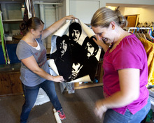 Lisa Rowland and Tiffany Morris laugh as they find a velvet poster of the Beatles in the f