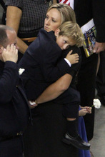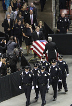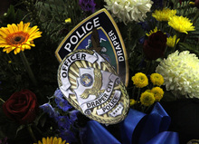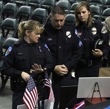 The two-hour service at the Maverik Center which attracted more than 4,000 attendees began solemnly Friday morning as bag pipers and a Draper City police color guard wearing white carnations pinned to their chests marched slowly into the arena. Behind them, Johnson's widow, Shante´ Sidwell Johnson, followed a flag-draped casket.