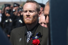 The officer's brother, Darin Johnson, asked the crowd to "take a brief moment to take a deep breath and feel my brother's presence. He's here with us, giving us a warm hug."