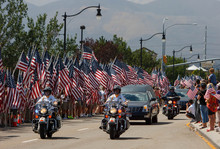 Darin Johnson, the fallen officer's brother, led the pall bearers. After the coffin was loaded into the hearse, dozens of police motorcycles roared to life, leading a motorcade procession of hundreds of police cars and firetrucks to the south end of the valley through the city of Draper before arriving at the burial site in Sandy.