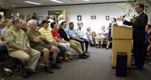 U.S. Rep. Chris Stewart came through a side door at the Sweet Library in Salt Lake City's Avenues district and took the podium to face a mostly polite but intense audience wanting answers about his positions on environmental issues, immigration reform, the Affordable Care Act and Syria.
