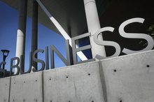 A portion of the sign announcing the name of the new Spencer Fox Eccles Business Building at the University of Utah, Thursday, September 5, 2013.
