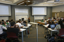 Assistant Professor Lyda Bigelow teaches a business management class in one of the many new classrooms in the new Spencer Fox Eccles Business Building at the University of Utah, Thursday, September 5, 2013.