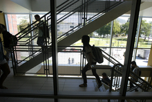 Students use one of the staircases between classes inside the new Spencer Fox Eccles Business Building at the University of Utah, Thursday, September 5, 2013.