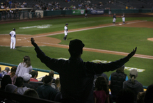 Bees fans watch as Bees RF Drew Heid is about to gather in a long fly ball. The Bees are trailing 3-0 in game 4 of the PCL Championship Series against the Omaha Storm Chasers, in the fifth inning, Saturday, September 14, 2013.