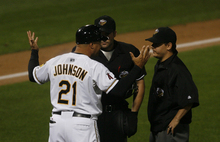 Bees manager Keith Johnson gives the umpiring crew a piece of his mind after a strange
