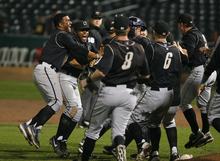 The Omaha Storm Chasers celebrate their PCL Championship win. After a disastrous six-run eighth inning, the Bees lost game 4 of the PCL Championship Series 10-5 to the Omaha Storm Chasers, Saturday, September 14, 2013.