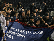 The Omaha Storm Chasers celebrate their PCL Championship win. After a disastrous six-r