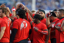 Utes celebrate the win as the BYU Cougars host the Utah Utes, college football Saturday, September 21, 2013 at LaVell Edwards Stadium in Provo.
