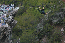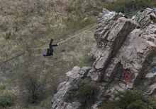 Cameron Kolk's path is narrow a 1-inch strand of webbing but not straight. It bows and bobs as he steps over a 120-foot drop off above crags and shards of graffiti.