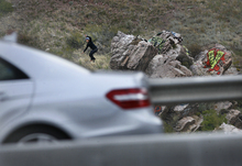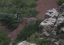 From a side view, highlining looks, literally, like a walk on the crazy-stupid line. A small crowd of passers-by gawk from the Bonneville Shoreline Trail, and members of a public works crew near Parleys Creek cross their arms and shake their heads.