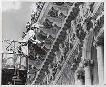 Fred Jex cleans the facade at the Capitol Theatre. June 3, 1977.