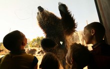 l-r Andrew Ogilvie, 7, and Drezden Miller , 3, get up close to a grizzly bear licking honey off the enclosure's window. Costumed kids roamed Hogle Zoo Saturday, October 5, 2013, during Zooperhero Day to learn about the super strength, sight, hearing and smells that the zoo animals have.