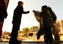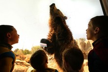 l-r Andrew Ogilvie, 7, and Drezden Miller , 3, get up close to a grizzly bear licking honey o