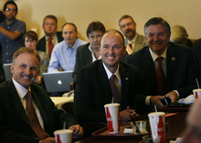 Gov. Gary Herbert, who picked Cox to replace outgoing Lt. Gov. Greg Bell, thanked Bell for his years of service and welcomed "the incoming lieutenant governor. … What's your name again?"