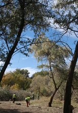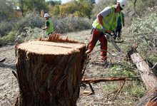 Trees, Inc. employees, contracted by Rocky Mountain Power, cut down a Russian olive tree along the Jordan River, October 21, 2013, in an effort to remove invasive species and restore critical habitat along the river corridor. The City of West Jordan and the Jordan River Commission are partnering with multiple agencies including Rocky Mountain Power and the Utah Conservation Corps. The Big Bend Habitat Restoration Project will restore 70 acres of habitat for migratory birds and other wildlife.