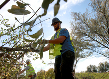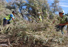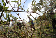 Trees, Inc. employees, (l to r) Tyson Malae, Nick Bleckert and Wayne Rose, contracted by Rocky Mountain Power, remove a Russian olive tree along the Jordan River, October 21, 2013, in an effort to remove invasive species and restore critical habitat along the river corridor. The City of West Jordan and the Jordan River Commission are partnering with multiple agencies including Rocky Mountain Power and the Utah Conservation Corps. The Big Bend Habitat Restoration Project will restore 70 acres of habitat for migratory birds and other wildlife.