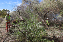 Trees, Inc. employees Nick Bleckert, right, and Trent Morris, contracted by Rocky Mountain Power, cut up a Russian olive tree along the Jordan River, October 21, 2013, in an effort to remove invasive species and restore critical habitat along the river corridor. The City of West Jordan and the Jordan River Commission are partnering with multiple agencies including Rocky Mountain Power and the Utah Conservation Corps. The Big Bend Habitat Restoration Project will restore 70 acres of habitat for migratory birds and other wildlife.