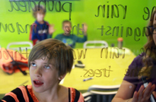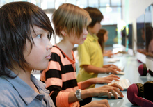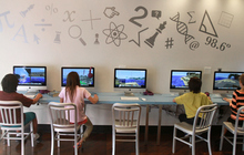 Kids huddle at computers lining a wall covered in large decals of chess pieces, DNA and mathematical symbols, the game of Minecraft on their screens.