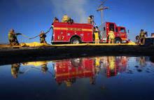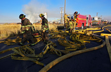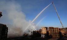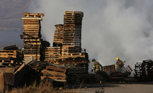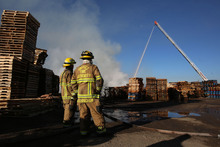 Firefighters rushed to a two-alarm blaze Wednesday morning on wooden pallets stored on a rural lot along the Salt Lake City and Magna city line, causing a traffic shutdown on Highway 201 near 7200 West.