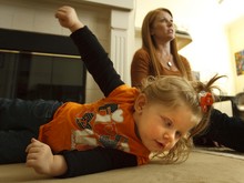 Denver • Piper rolls back and forth across a large blanket on the living room floor, windmilling her arms and kicking her legs.