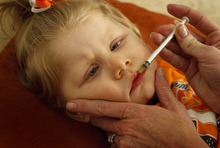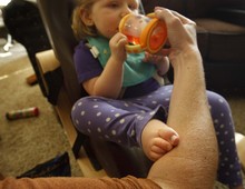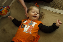 "Who's a happy girl?" asks her mom, Annie Koozer, kneeling over the 2-year-old with a small, oil-filled syringe. Piper fusses as Annie squirts a tiny amount into the side of her mouth.