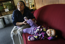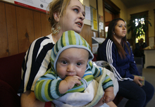 Twenty-year-old Kimberly Kropf has been on and off food stamps for three years. She is a single mom with a 3-year-old daughter and an 8-month-old son and works 12 hours a week.