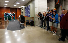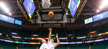 Fans look on as the Utah Jazz prepare to take the floor, hosting the Oklahoma City Thunder, NBA Basketball at EnergySolutions Arena in Salt Lake City, Wednesday October 30, 2013.
