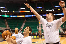 Utah Jazz center Enes Kanter (0) shoots over assistant coach Alex Jensen during warmups as