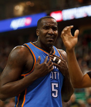 Oklahoma City Thunder center Kendrick Perkins (5) protests a call as the Utah Jazz host the