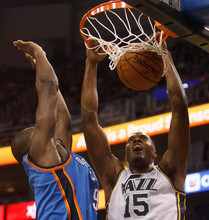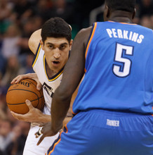 Utah Jazz center Enes Kanter (0), defended by Oklahoma City Thunder center Kendrick Perkins