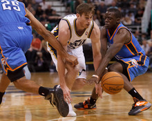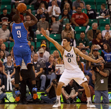 The Utah Jazz take the floor, hosting the Oklahoma City Thunder, NBA Basketball at EnergySolutions Arena in Salt Lake City, Wednesday October 30, 2013.