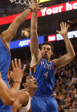 Utah Jazz center Enes Kanter (0) looks for the shot, defended by Oklahoma City Thunder forward Nick Collison (4) as the Utah Jazz host the Oklahoma City Thunder, NBA Basketball at EnergySolutions Arena in Salt Lake City, Wednesday October 30, 2013.