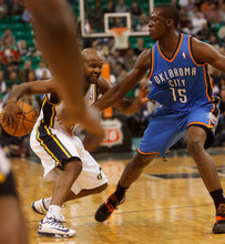 Utah Jazz guard John Lucas III (5) looks to drive around Oklahoma City Thunder guard Reggie