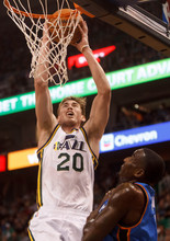 Utah Jazz guard Gordon Hayward (20) dunks the ball, as the Utah Jazz host the Oklahoma City Thunder, NBA Basketball at EnergySolutions Arena in Salt Lake City, Wednesday October 30, 2013.