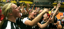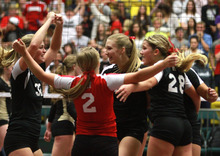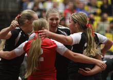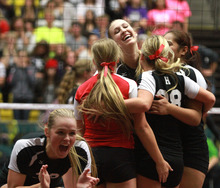 Hurricane High celebrates a big score as they come with in two points of winning the their 3A volleyball State Championship title over Desert Hills, Saturday, November 2, 2013.