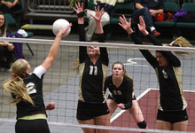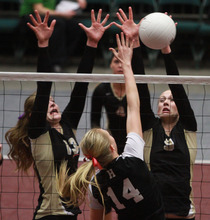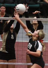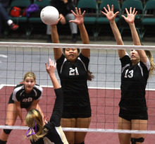 Desert Hill's Blair Bliss (4) knocks the ball over the net, as Sela Filo (21) and Malary Reid (13) defend for Hurricane, in the 3A volleyball State Championship game, Saturday, November 2, 2013.
