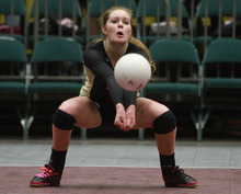 Desert Hill'sLauren Kamalu (8) defends Addie Edwards shot for Hurricane, in the 3A volleyball