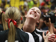 Kyndall Gardner and Malary Reid, Hurricane, celebrate their win over Desert Hills, in th 3A volleyball State Championship, Saturday, November 2, 2013.