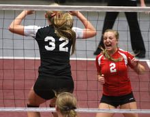 Brooklyn Gubler (32) and Hannah Rich, Hurricane, celebrate a score, as they defeated Desert Hills, in the 3A volleyball State Championship, Saturday, November 2, 2013.