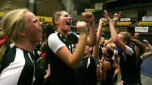 Kyndall Gardner (left) hugs Carrie Marshall (right) as Hurricane High celebrates their 3A vol