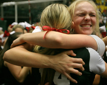 Kyndall Gardner (left) hugs Carrie Marshall (right) as Hurricane High celebrates their 3A volley ball State Championship title over Desert Hills, Saturday, November 2, 2013.