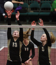 Desert Hill's Alexa Goulding (11) and Aubrey Farrer defend as Brooklyn Gubler (32) hits the ball for Hurricane, in the 3A volleyball State Championship game, Saturday, November 2, 2013.