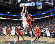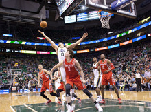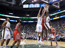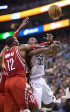 Jazz guard Gordon Hayward posterizes Rockets guard Aaron Brooks in the first half of a game against the Houston Rockets on Saturday, Nov. 2, 2013, at EnergySolutions Arena in Salt Lake City.