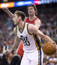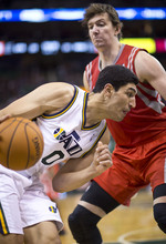 Jazz guard Gordon Hayward drives past Rockets center Omer Asik in the first half of a game