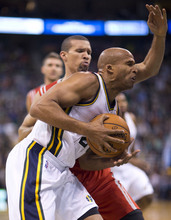 Jazz forward Richard Jefferson draws a foul from Rockets guard Francisco Garcia in the first half of a game against the Houston Rockets on Saturday, Nov. 2, 2013, at EnergySolutions Arena in Salt Lake City.