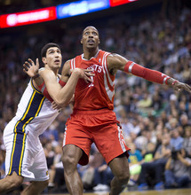 Jazz forward Mike Harris draws a foul from Rockets center Dwight Howard in the first half of a game against the Houston Rockets on Saturday, Nov. 2, 2013, at EnergySolutions Arena in Salt Lake City.