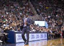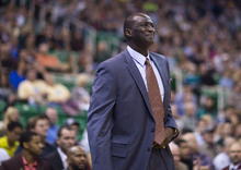 Utah Jazz coach Tyrone Corbin reacts to a foul call in the first half of a game against the Houston Rockets on Saturday, Nov. 2, 2013, at EnergySolutions Arena in Salt Lake City.